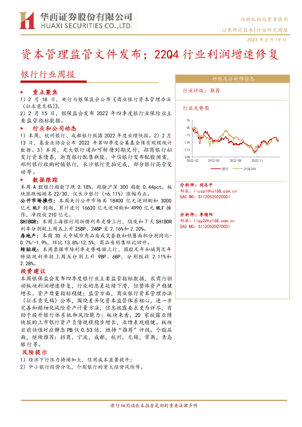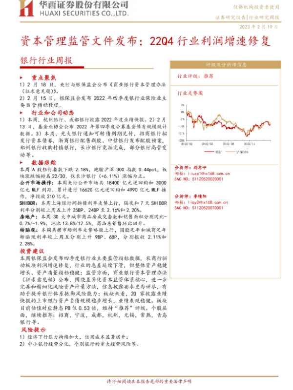 【华西证券】【20230219】银行行业周报:资本管理监管文件发布;22Q4行业利润增速修复-10页