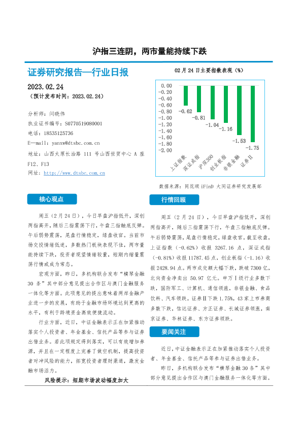 【大同证券】【20230224】沪指三连阴,两市量能持续下跌-10页
