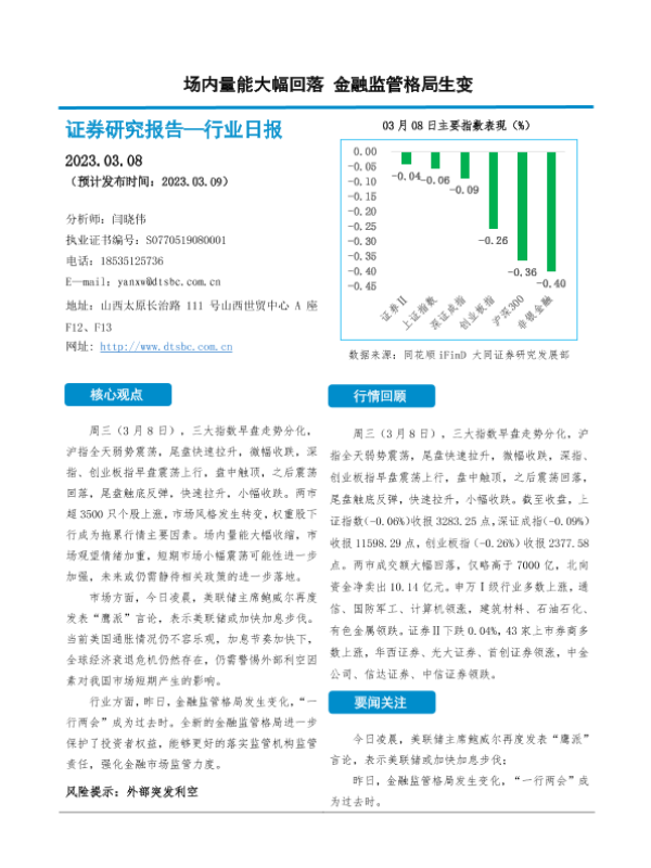 【大同证券】【20230308】非银金融行业日报:场内量能大幅回落 金融监管格局生变-10页