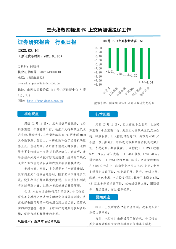 【大同证券】【20230316】非银金融行业日报:三大指数跌幅逾1% 上交所加强投保工作-10页
