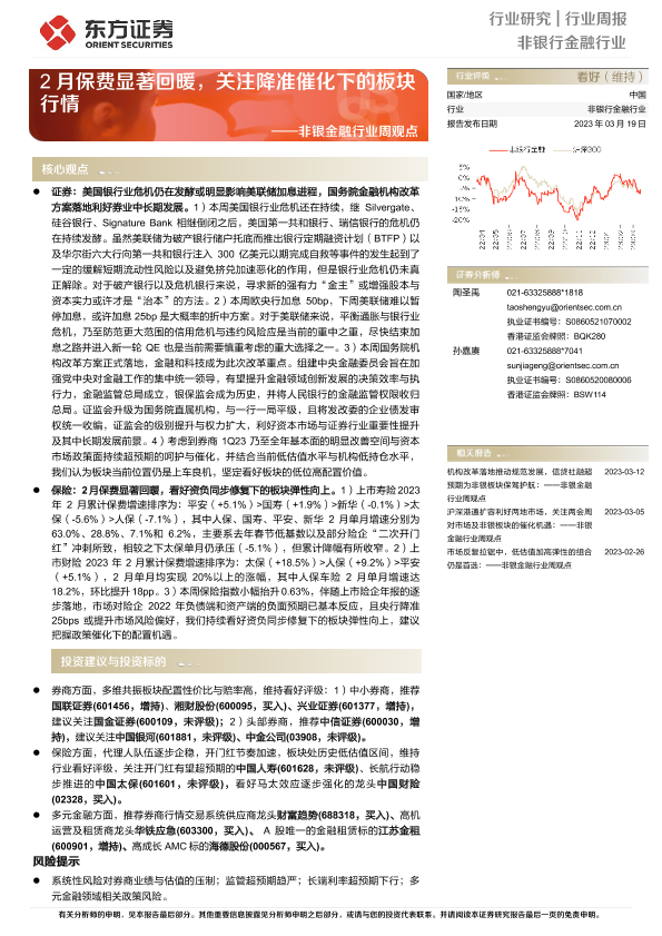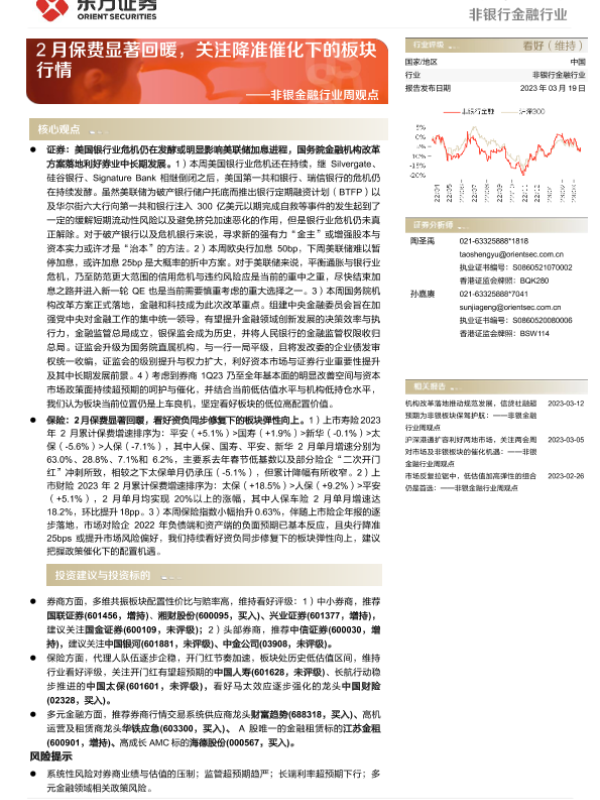 【东方证券】【20230319】非银金融行业周观点:2月保费显著回暖,关注降准催化下的板块行情-13页