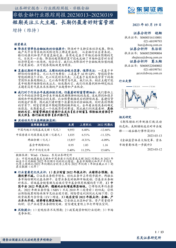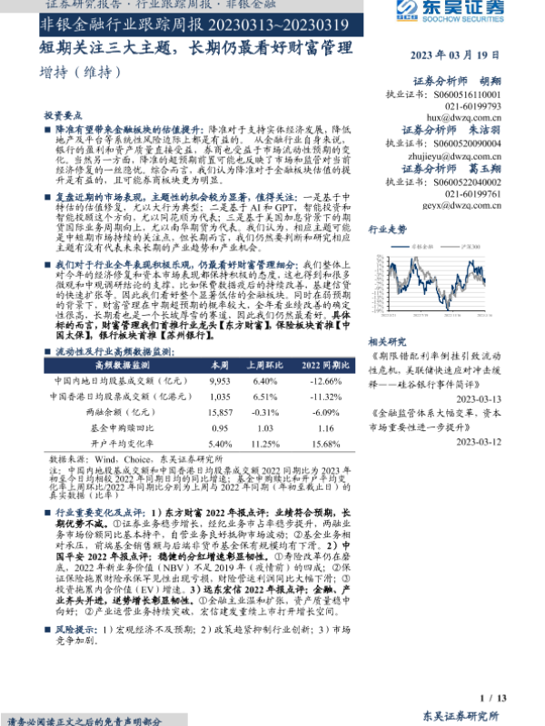 【东吴证券】【20230319】非银金融行业跟踪周报:短期关注三大主题,长期仍最看好财富管理-13页