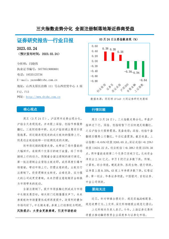 【大同证券】【20230324】证券行业日报:三大指数走势分化 全面注册制落地渐近券商受益-10页