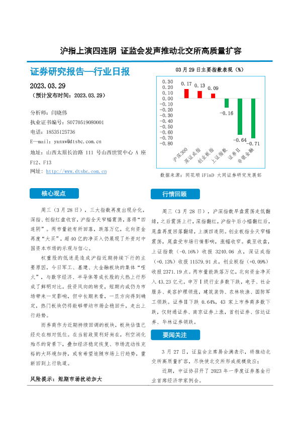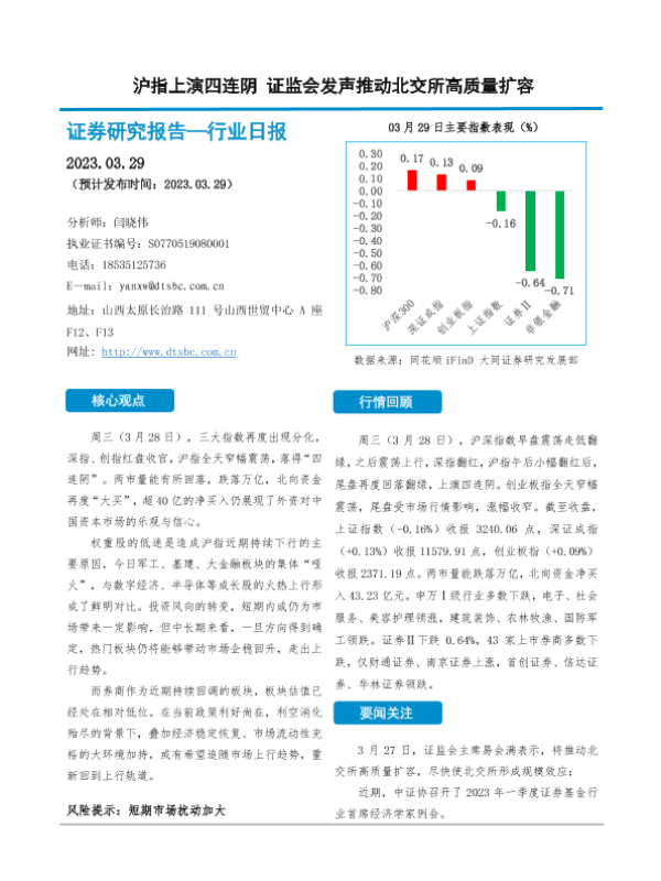 【大同证券】【20230329】非银金融行业日报:沪指上演四连阴 证监会发声推动北交所高质量扩容-10页