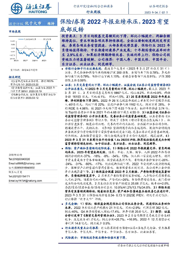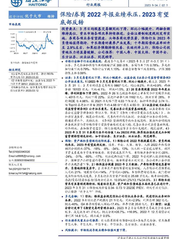 【海通证券】【20230402】综合金融服务行业周报:保险 券商2022年报业绩承压,2023有望底部反转-12页