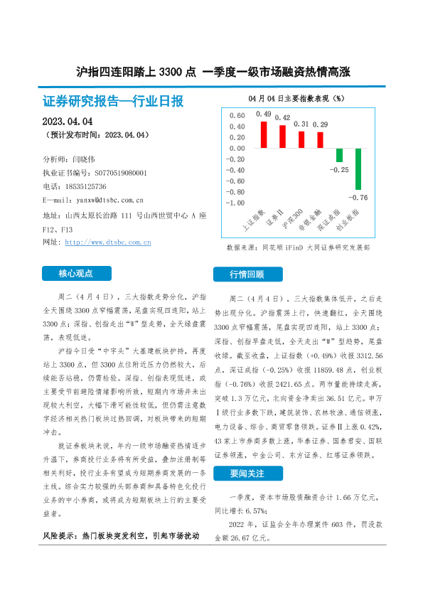 【大同证券】【20230404】非银金融日报:沪指四连阳踏上3300点一季度一级市场融资热情高涨-10页