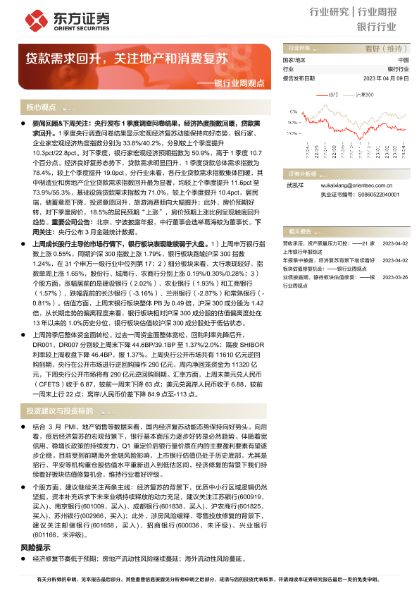 【东方证券】【20230409】银行业周观点:贷款需求回升,关注地产和消费复苏-12页