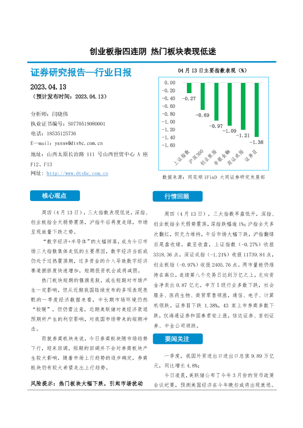 【大同证券】【20230413】非银金融行业日报:创业板指四连阴 热门板块表现低迷-10页