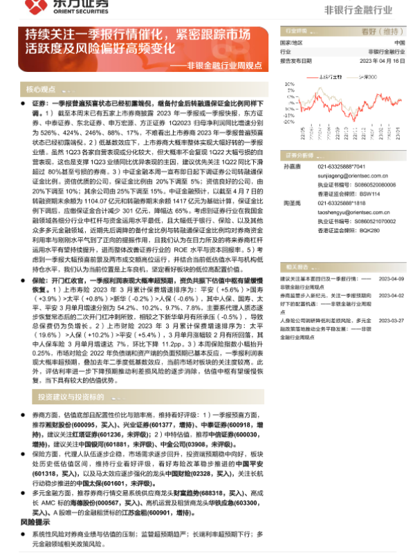 【东方证券】【20230416】非银金融行业周观点:持续关注一季报行情催化,紧密跟踪市场活跃度及风险偏好高频变化-13页