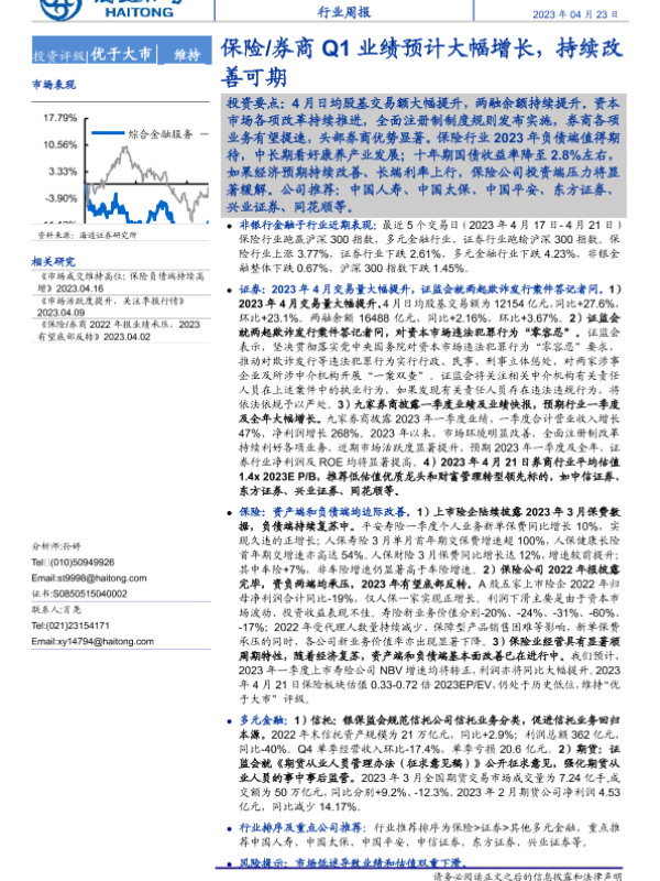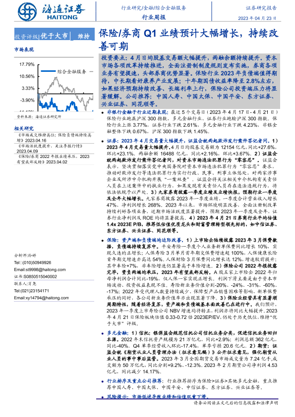 【海通证券】【20230423】金融行业周报:保险 券商Q1业绩预计大幅增长,持续改善可期-10页