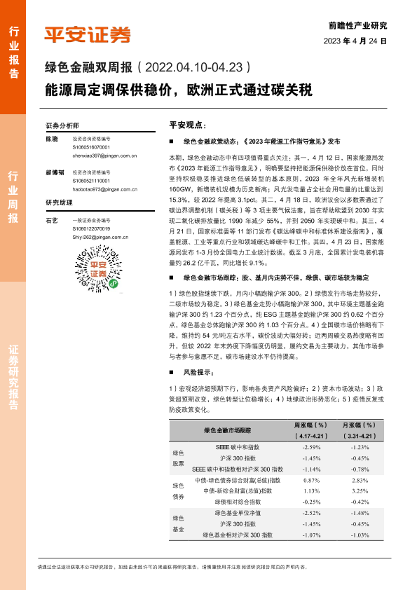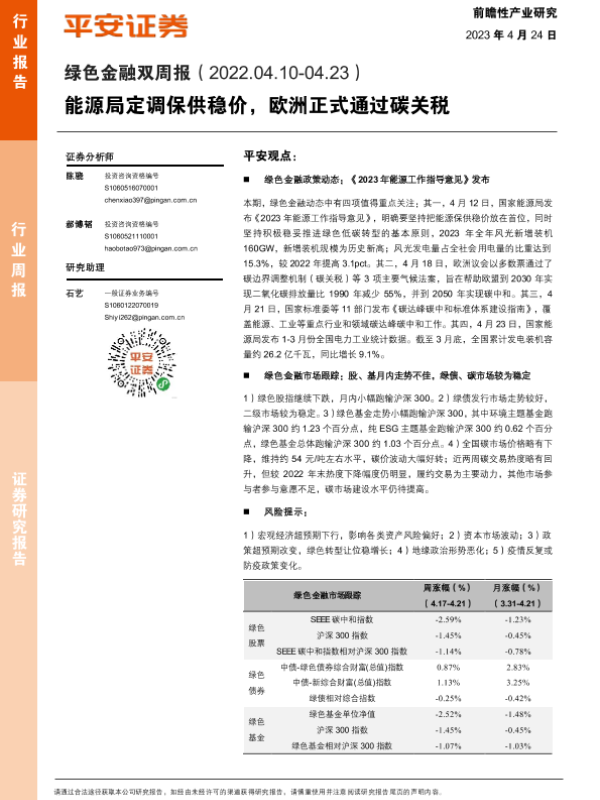 【平安证券】【20230424】绿色金融行业双周报:能源局定调保供稳价,欧洲正式通过碳关税-10页
