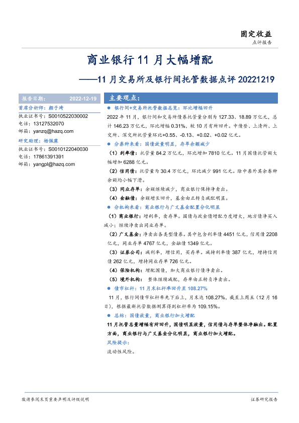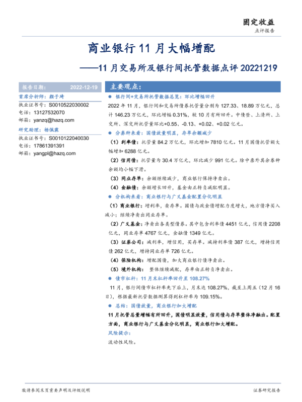 【华安证券】【20221219】11月交易所及银行间托管数据点评:商业银行11月大幅增配-16页