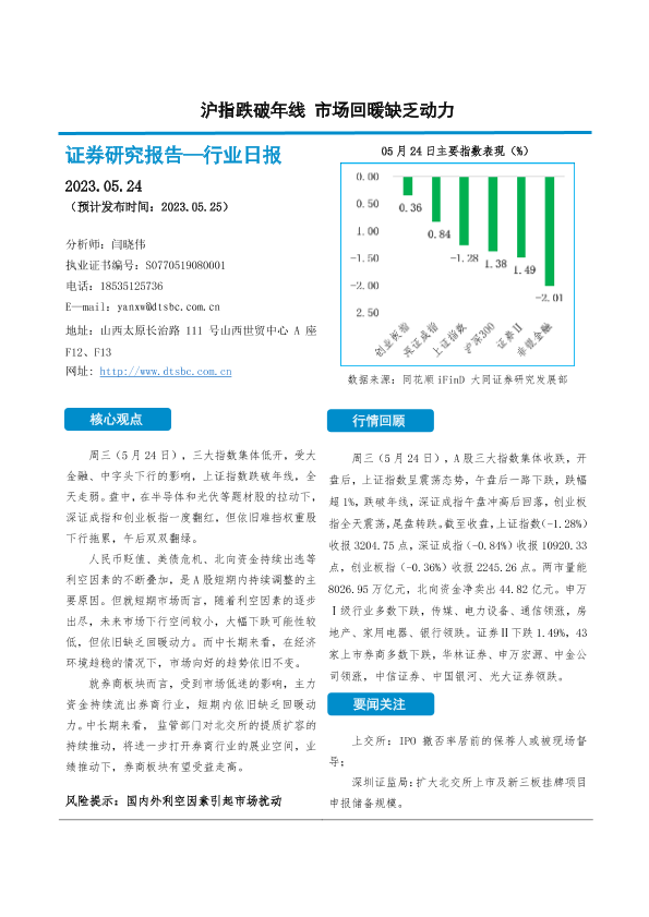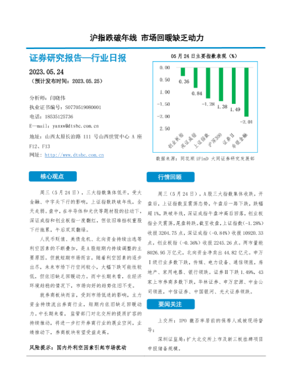 【大同证券】【20230524】沪指跌破年线 市场回暖缺乏动力-10页