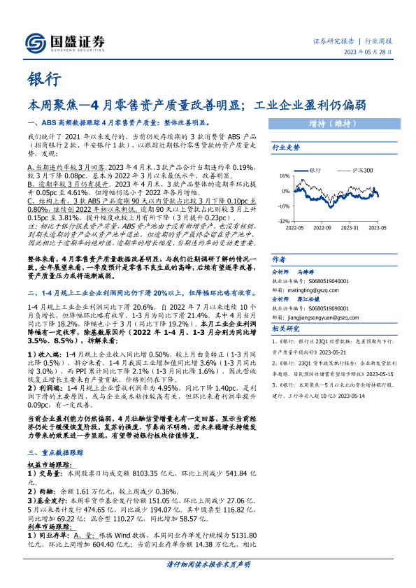 【国盛证券】【20230528】银行本周聚焦:4月零售资产质量改善明显;工业企业盈利仍偏弱-12页