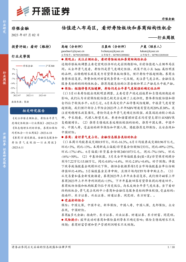 【开源证券】【20230702】非银金融行业周报:估值进入布局区,看好寿险板块和券商结构性机会-10页