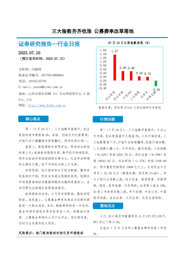 【大同证券】【20230710】非银金融行业日报:三大指数齐齐收涨 公募费率改革落地-10页