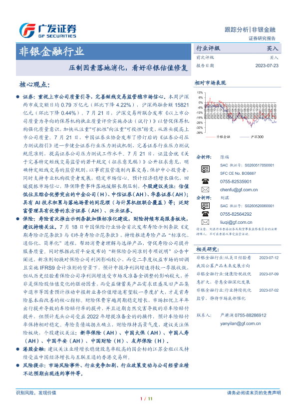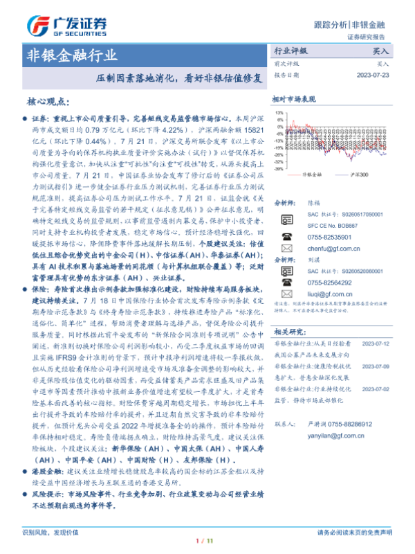 【广发证券】【20230723】非银金融行业跟踪分析:压制因素落地消化,看好非银估值修复-11页