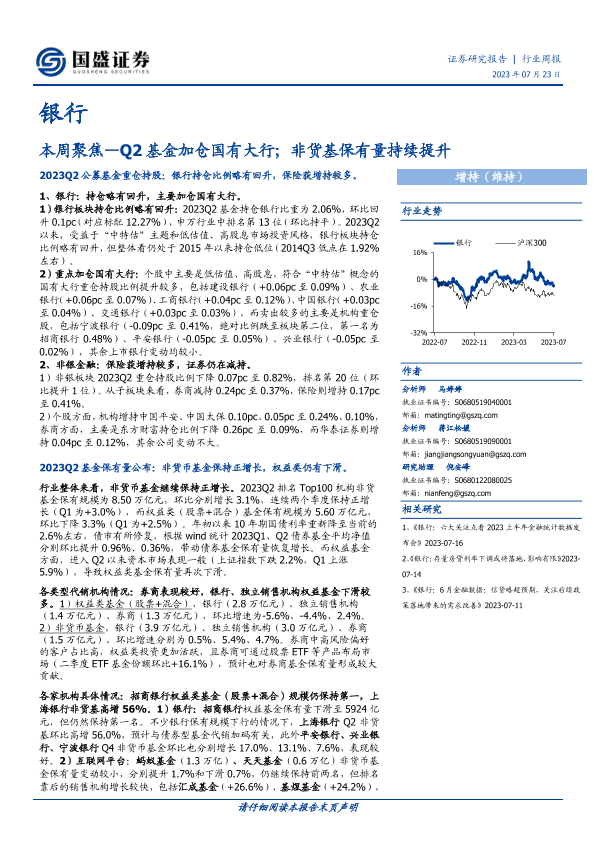 【国盛证券】【20230723】银行本周聚焦:Q2基金加仓国有大行;非货基保有量持续提升-14页