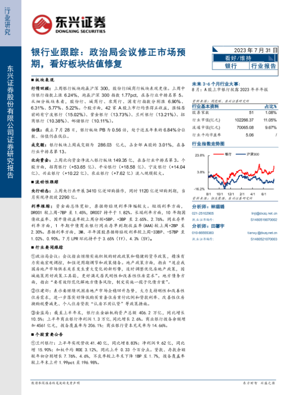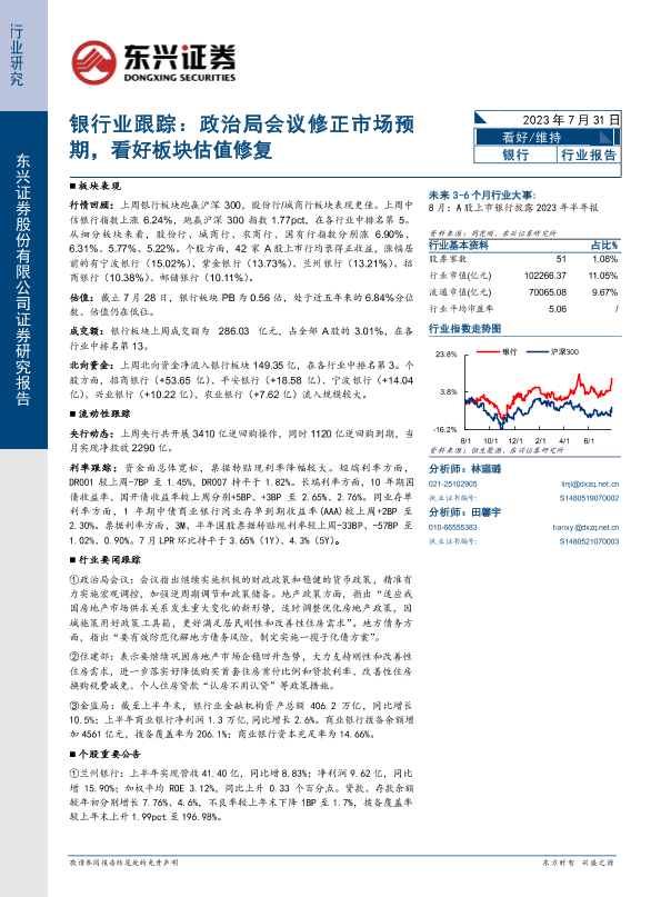 【东兴证券】【20230731】银行业跟踪:政治局会议修正市场预期,看好板块估值修复-11页