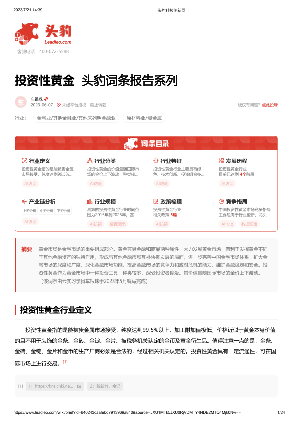 【头豹研究院】【20230721】投资性黄金 头豹词条报告系列-24页