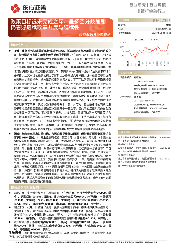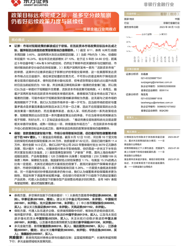 【东方证券】【20230813】非银金融行业周观点:政策目标远未完成之际,虽多空分歧加剧仍看好后续政策力度与延续性-14页