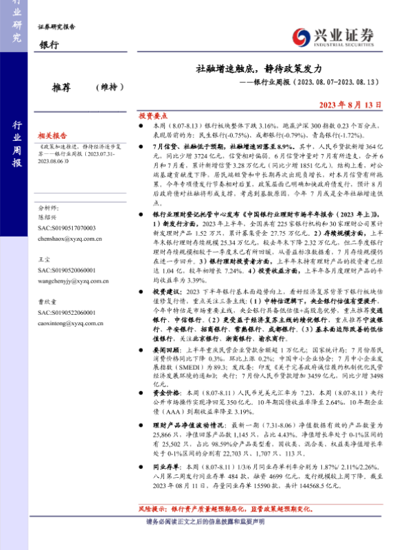 政策分析 理财产品 社融增速 经济复苏 银行业