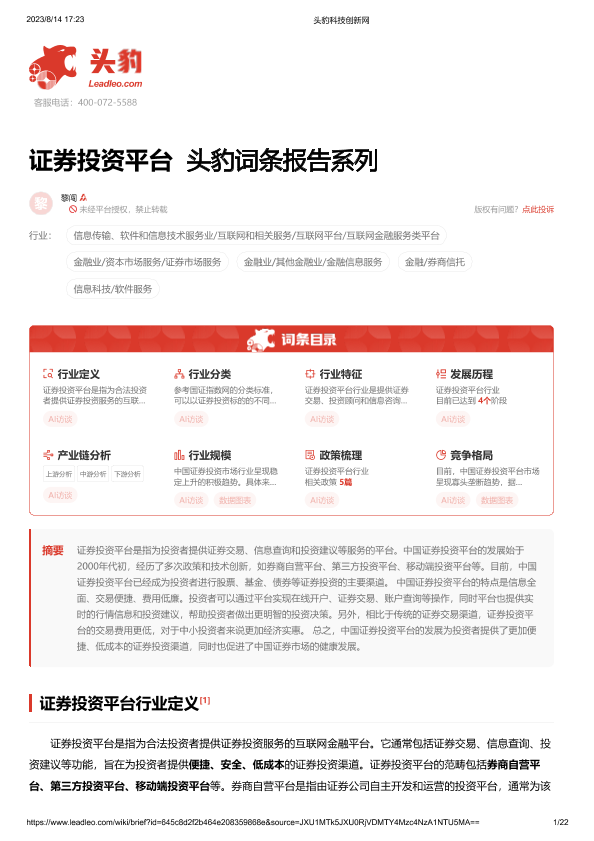 【头豹研究院】【20230814】证券投资平台 头豹词条报告系列-22页