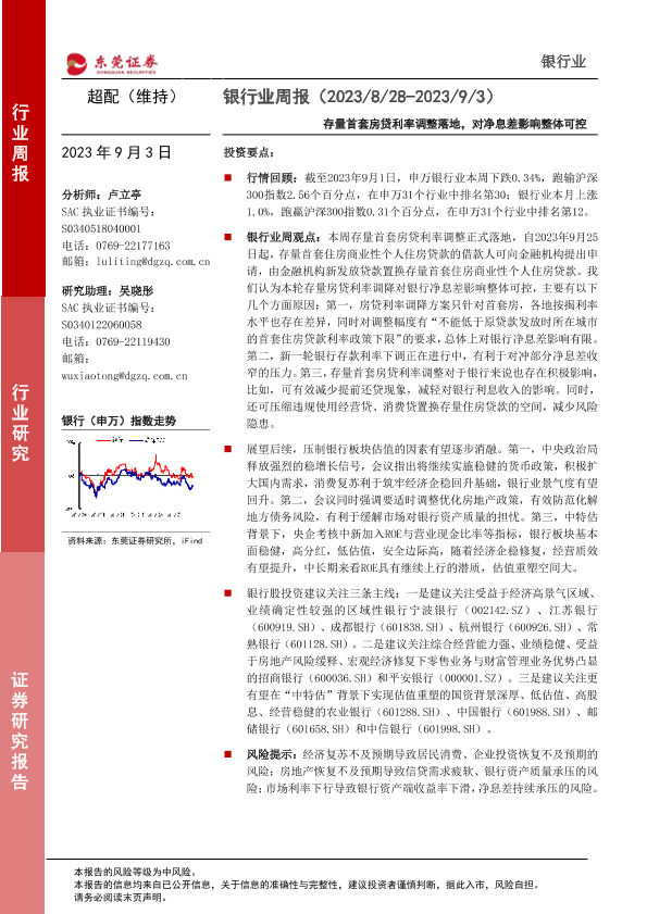 【东莞证券】【20230903】银行业周报:存量首套房贷利率调整落地,对净息差影响整体可控-11页