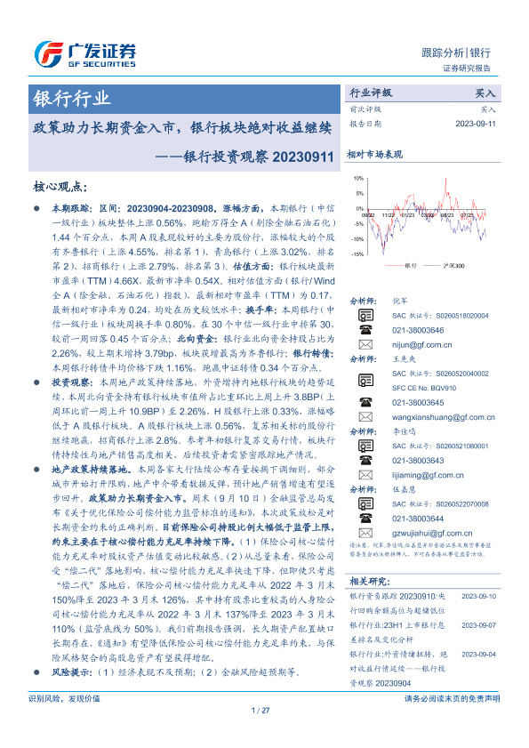 【广发证券】【20230911】银行投资观察:政策助力长期资金入市,银行板块绝对收益继续-27页