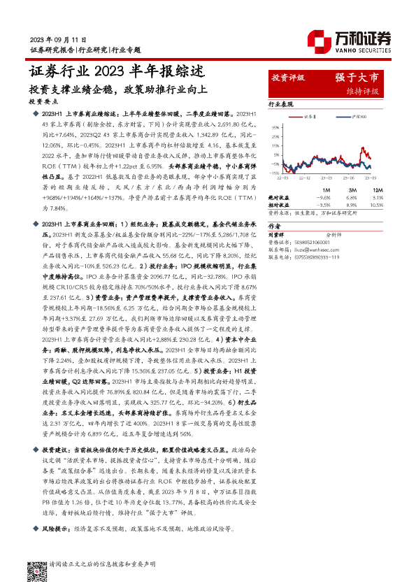 【万和证券】【20230911】证券行业2023半年报综述:投资支撑业绩企稳,政策助推行业向上-12页