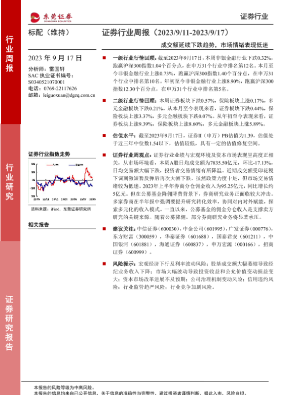 【东莞证券】【20230917】证券行业周报:成交额延续下跌趋势,市场情绪表现低迷-11页