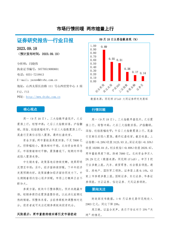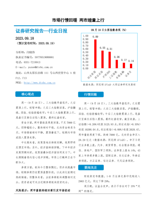 【大同证券】【20230918】非银金融行业日报:市场行情回暖 两市缩量上行-10页