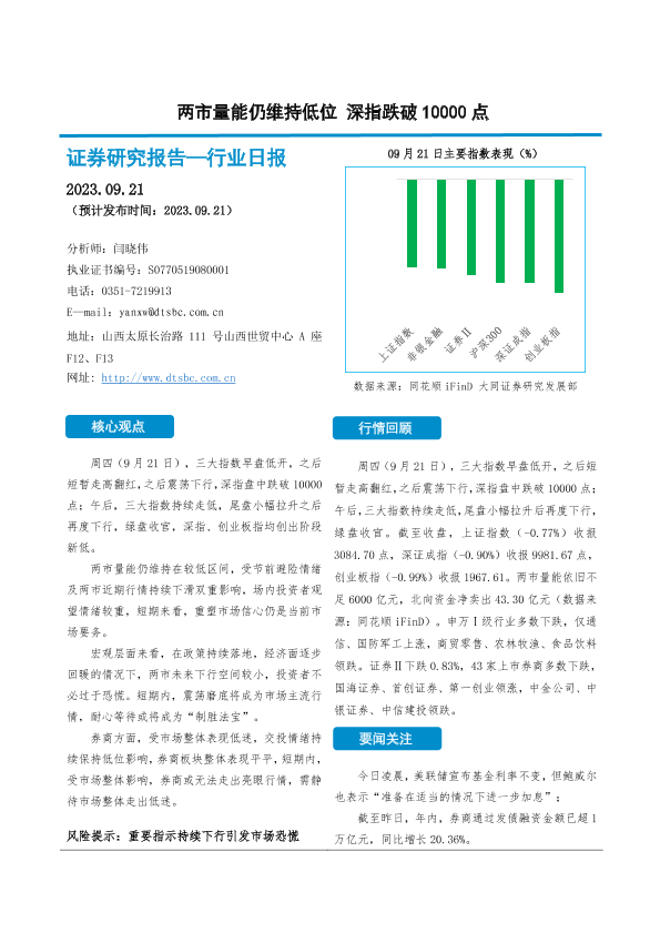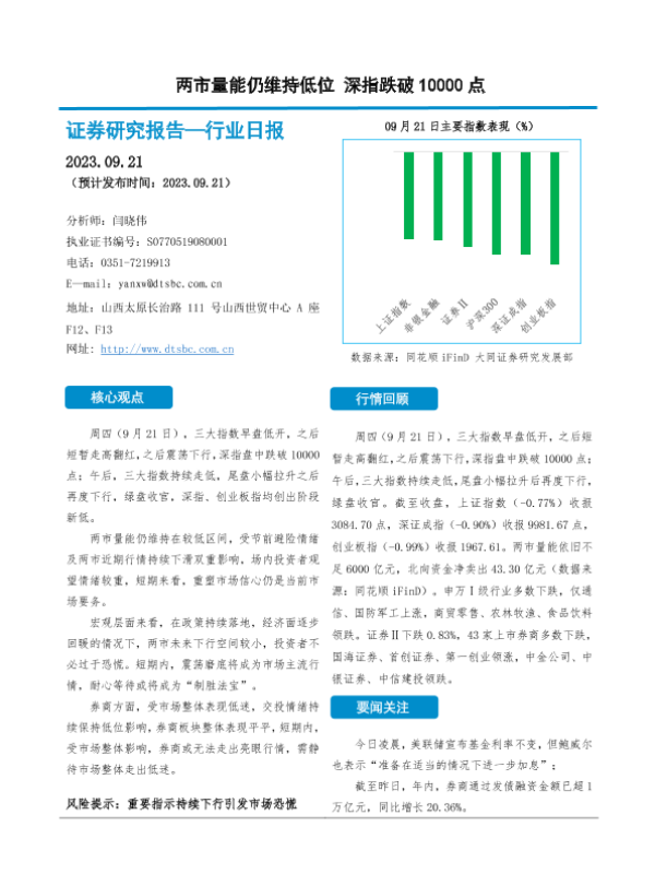 【大同证券】【20230921】两市量能仍维持低位 深指跌破10000点-10页