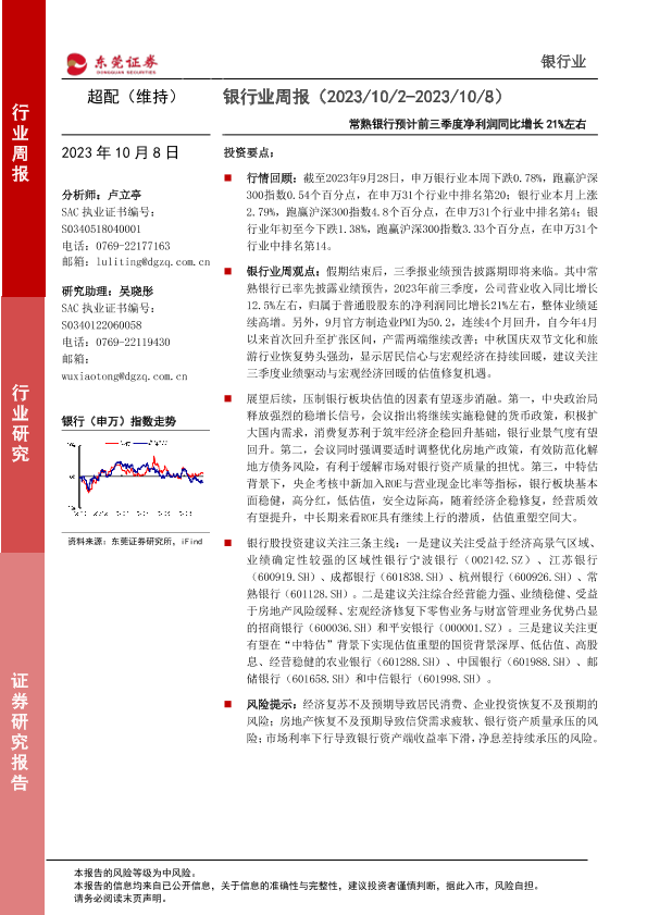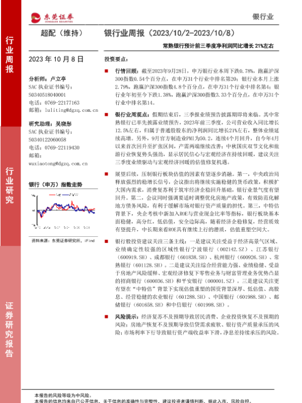 【东莞证券】【20231008】银行业周报:常熟银行预计前三季度净利润同比增长21%左右-11页