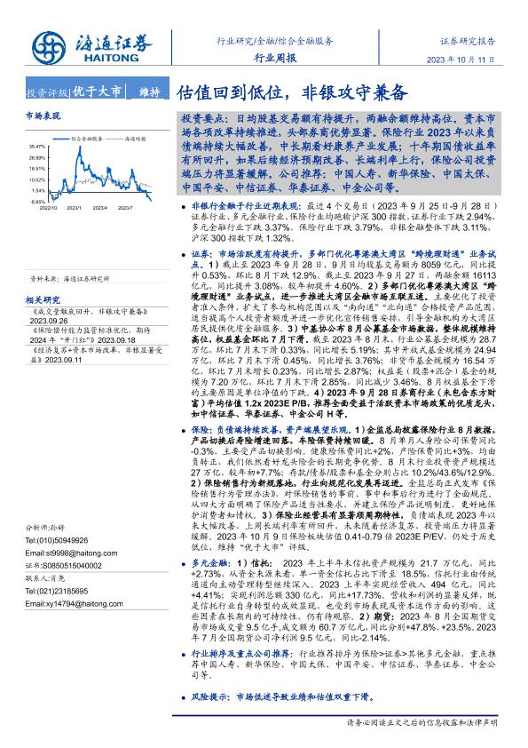 【海通证券】【20231011】综合金融服务行业周报:估值回到低位,非银攻守兼备-11页