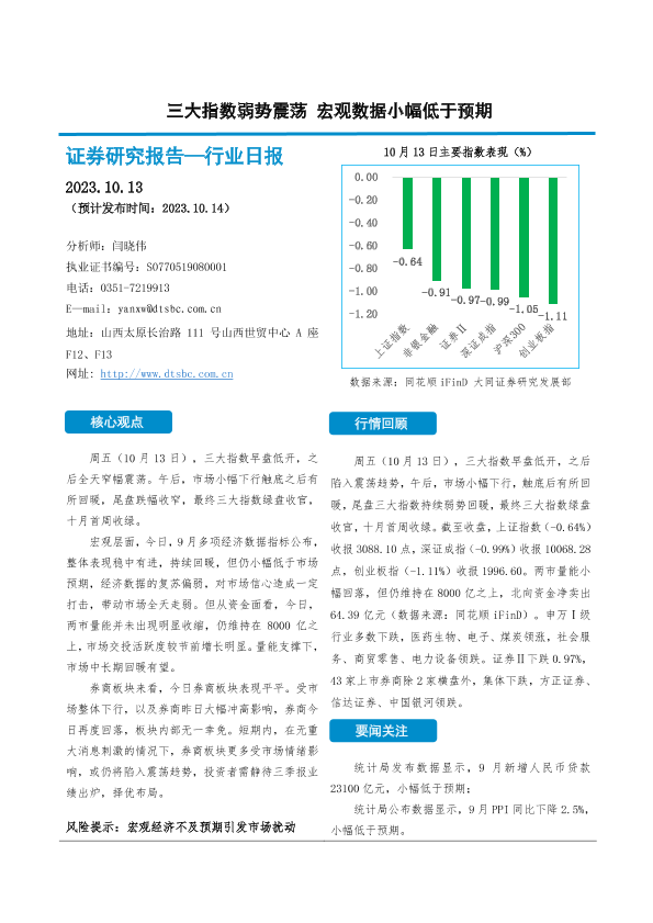 【大同证券】【20231013】非银金融行业日报:三大指数弱势震荡 宏观数据小幅低于预期-10页