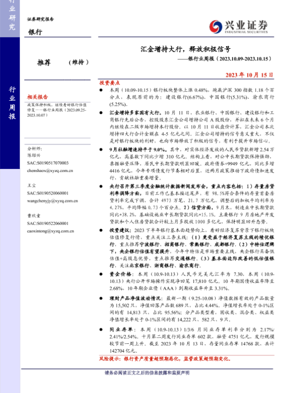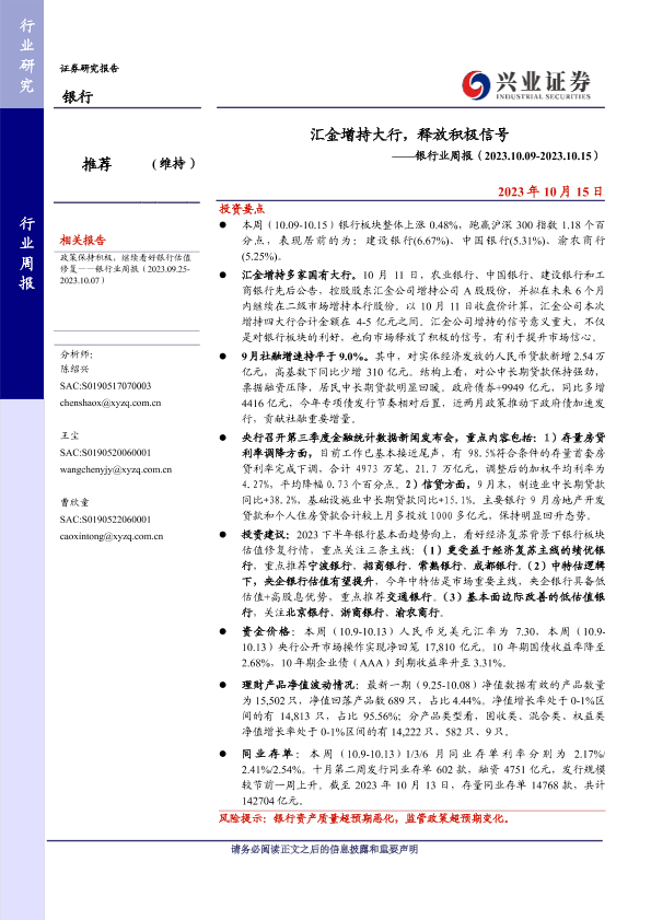 【兴业证券】【20231015】汇金增持大行,释放积极信号-15页