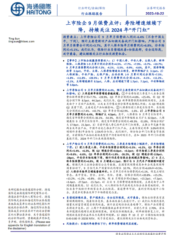 【海通国际】【20231022】上市险企9月保费点评:寿险增速继续下降,持续关注2024年“开门红”-12页