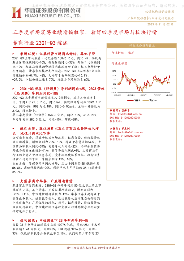 【华西证券】【20231102】券商行业23Q1-Q3综述:三季度市场震荡业绩增幅收窄,看好四季度市场与板块行情-20页