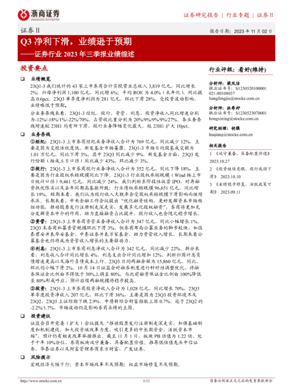 【浙商证券】【20231102】证券行业2023年三季报业绩综述:Q3净利下滑,业绩逊于预期-11页