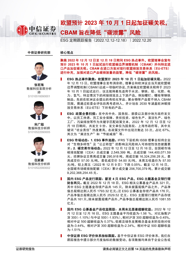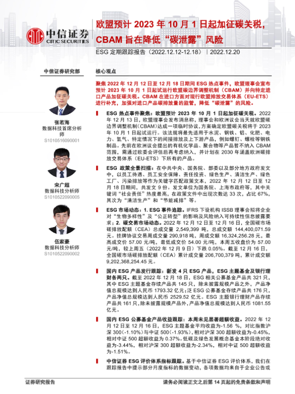 【中信证券】【20221220】ESG定期跟踪报告:欧盟预计2023年10月1日起加征碳关税,CBAM旨在降低“碳泄露”风险-15页