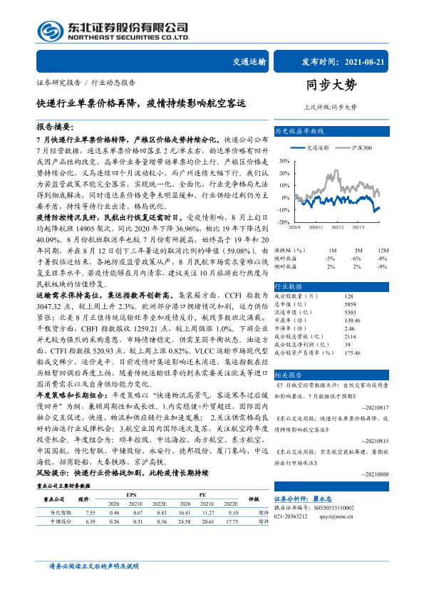 【东北证券】【20210821】交通运输行业:快递行业单票价格再降,疫情持续影响航空客运-16页