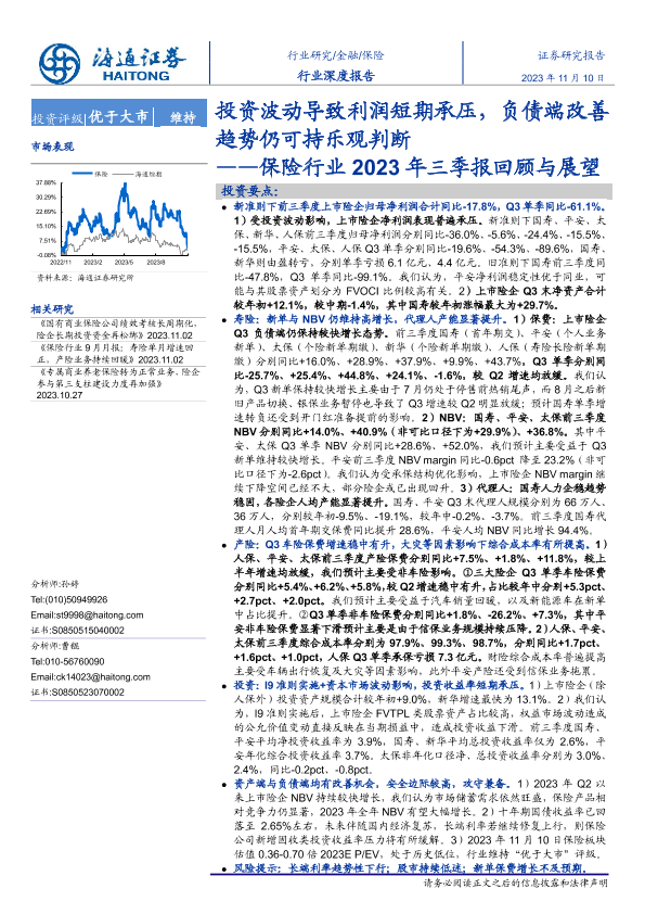 【海通证券】【20231110】2023年三季报回顾与展望:投资波动导致利润短期承压,负债端改善趋势仍可持乐观判断-11页
