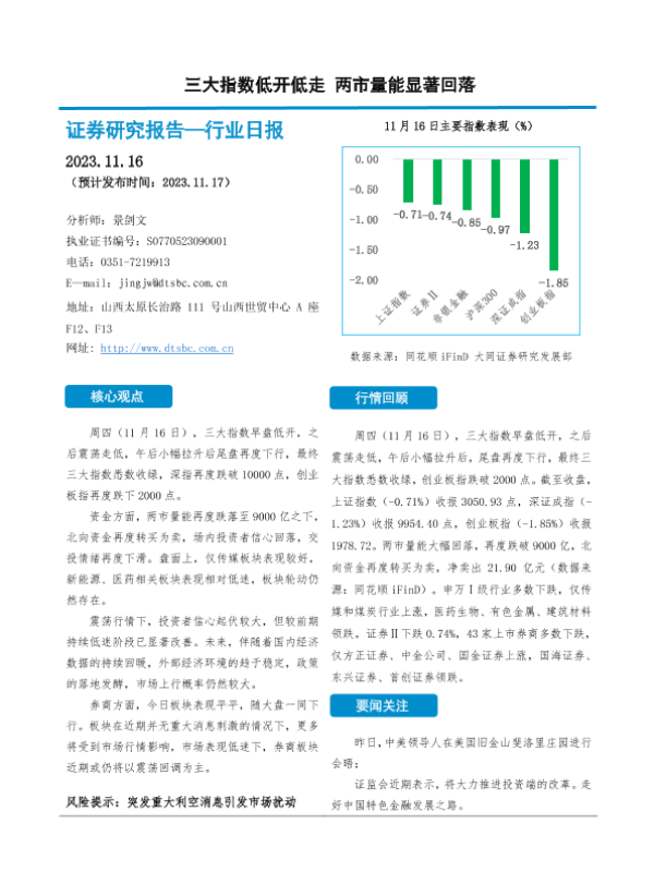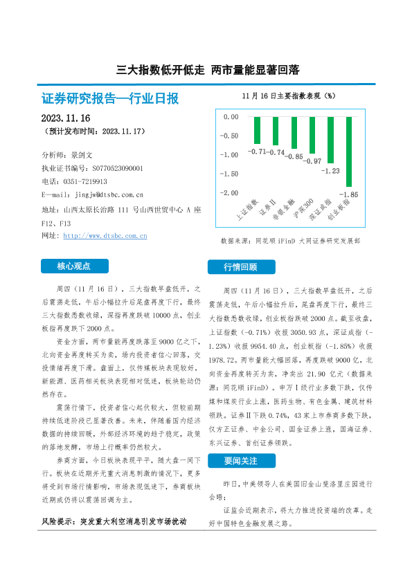 【大同证券】【20231116】非银金融行业日报:三大指数低开低走 两市量能显著回落-10页