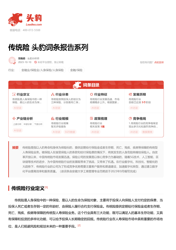 【头豹研究院】【20231010】传统险 头豹词条报告系列-18页