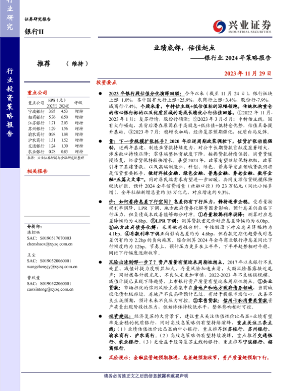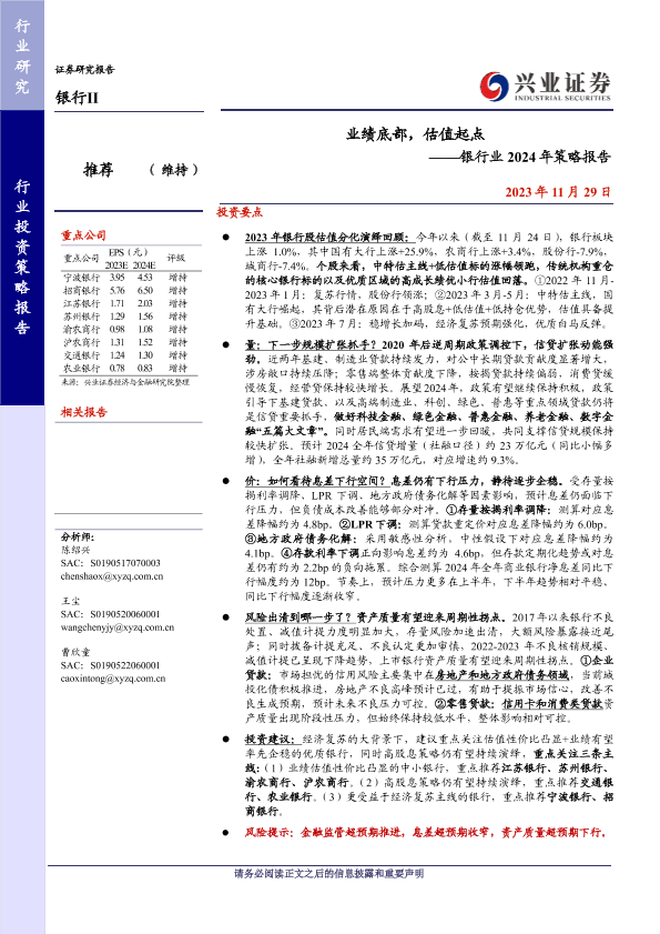 2024年策略 估值分析 息差预测 资产质量 银行业