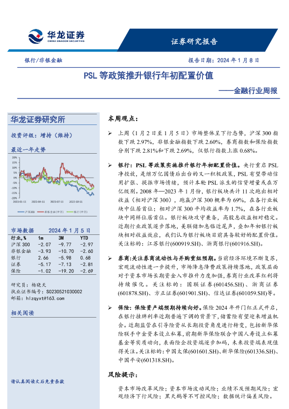 【华龙证券】【20240108】金融行业周报:PSL等政策推升银行年初配置价值-11页