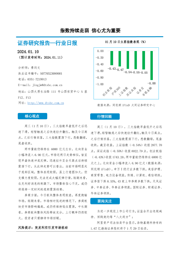 【大同证券】【20240110】非银金融行业日报:指数持续走弱 信心尤为重要-10页