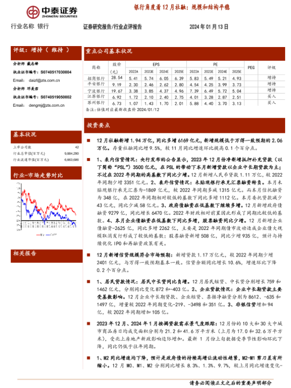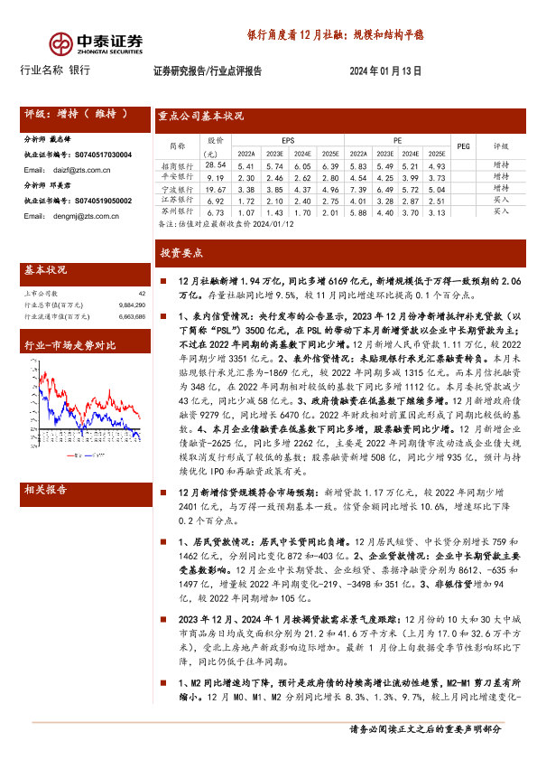 【中泰证券】【20240113】银行角度看12月社融:规模和结构平稳-17页