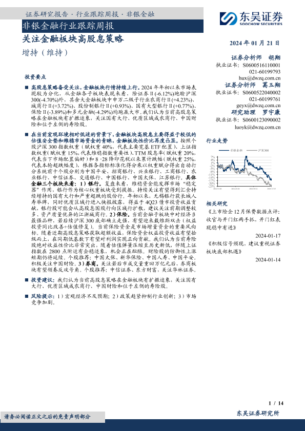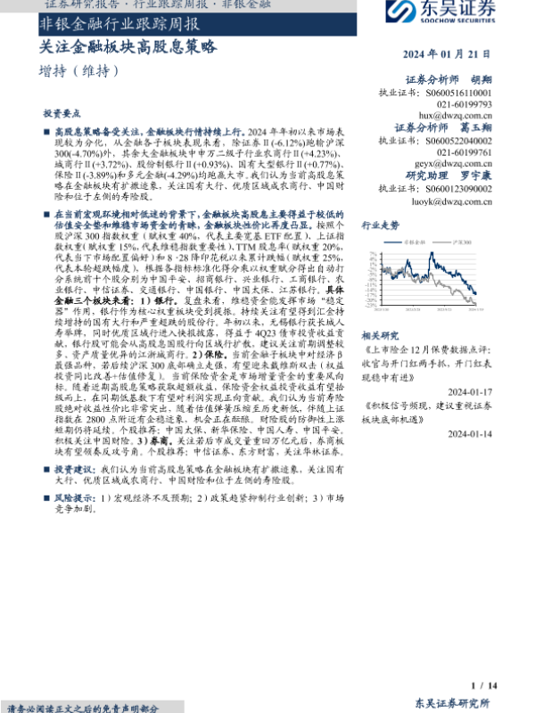 【东吴证券】【20240121】非银金融行业跟踪周报:关注金融板块高股息策略-14页